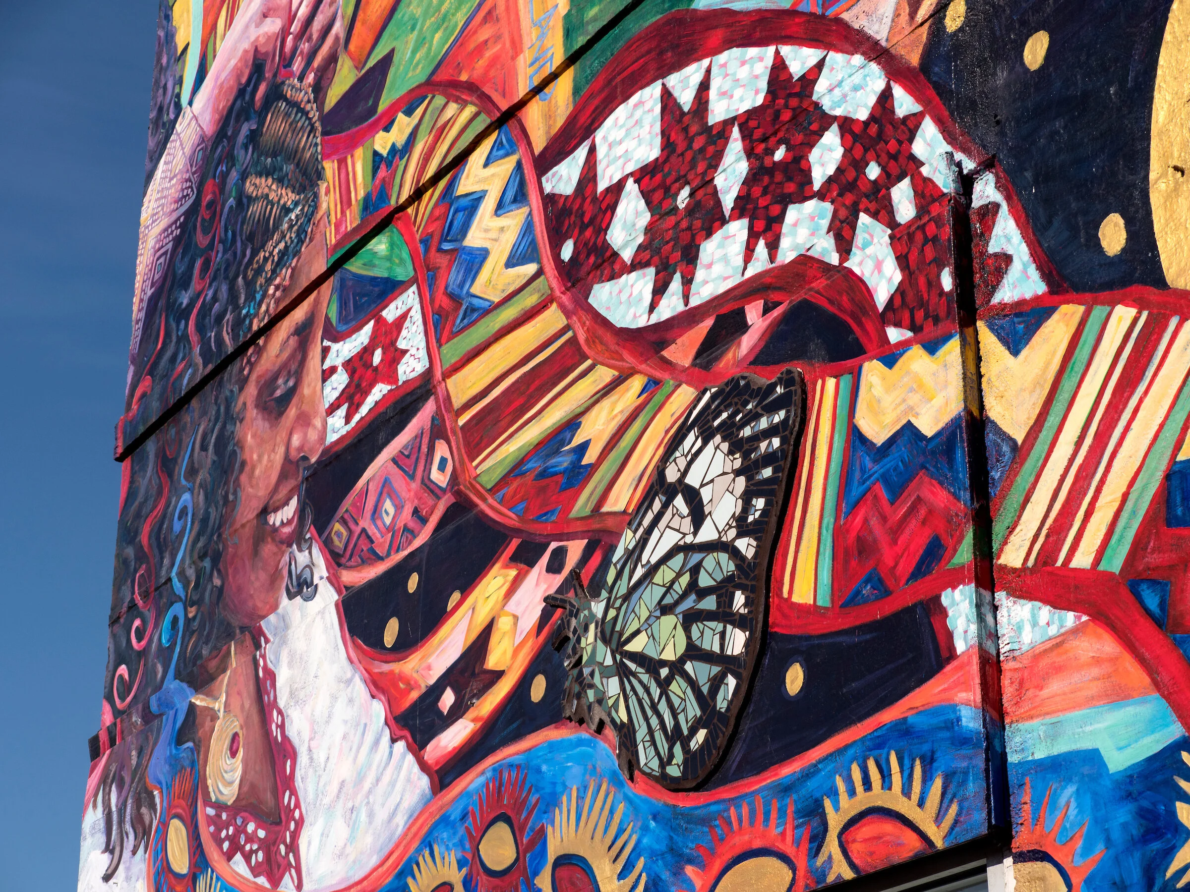 A 1200 Sq. ft. painted and mosaic mural made in collaboration with the Knights Foundation Funded Midway Murals Project 2015. This mural was created through a series of community listening sessions and with the help of interns from the African Economic Development Solutions & Little Africa. Acrylic on poly tab and porcelain tile mosaic.